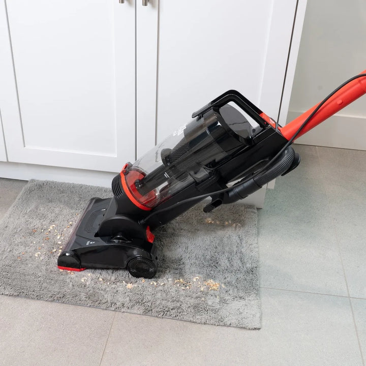 It is equipped with an extended-reach ovable wand for optimal cleaning down low and up high, with or without the 2-in-1 Crevice/Brush Tool. Continuous corded power means no loss of suction for whole home cleaning. Step-touch tilt reaches under furniture and provides easy maneuvering from room to room. The easy empty dirt cup has ample capacity and detaches from the vacuum to dispose of dirt and debris over a trash can or waste basket. A convenient cord wrap and accessory tool holder make storage neat and self-contained.